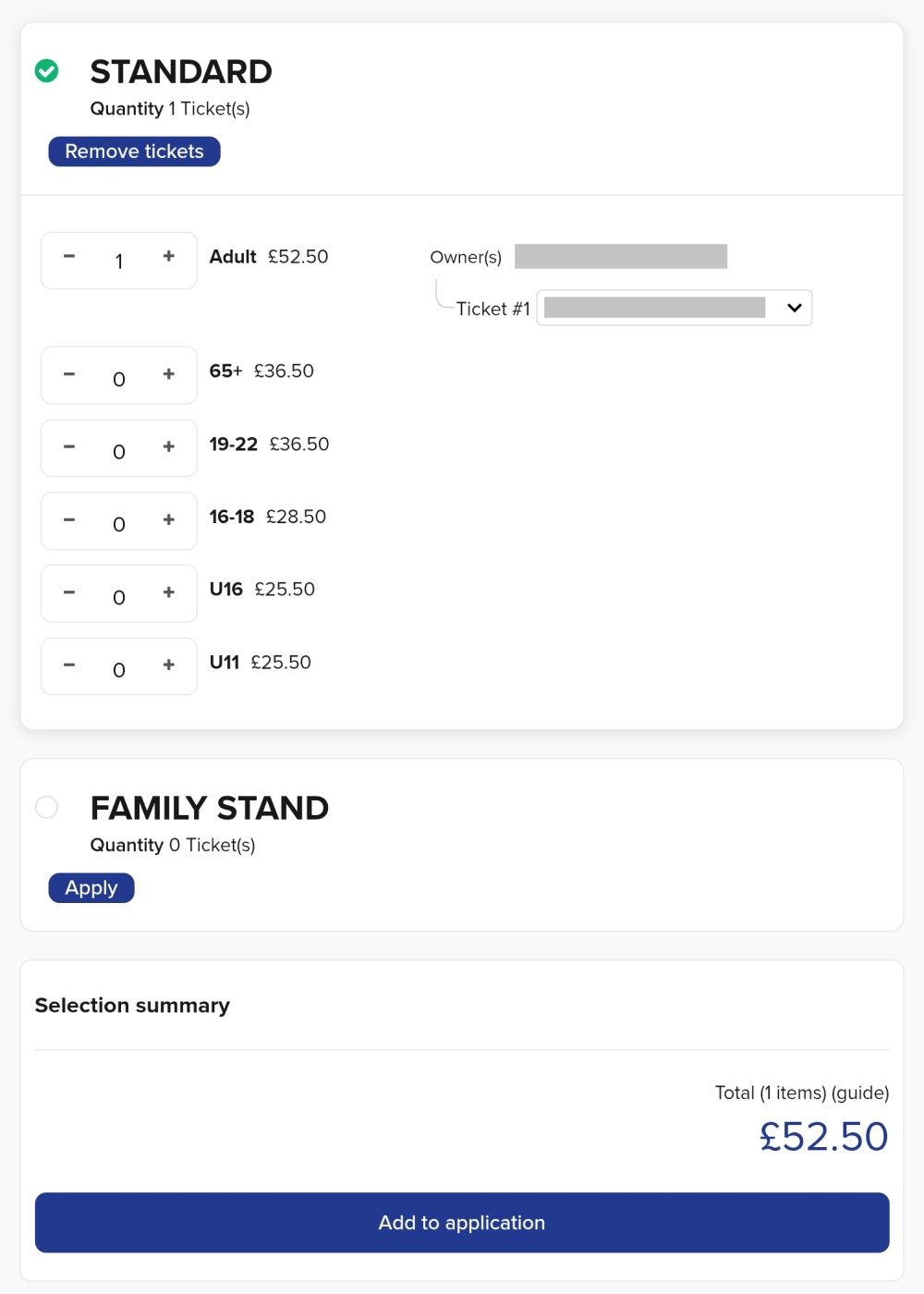 エリアや席の選択は不可で、「STANDARD」か「FAMILY STAND」の選択はできますが、大人のみの観戦であれば「STANDARD」一択になります。(正しい選択が出来ていない申請は無効となります。)