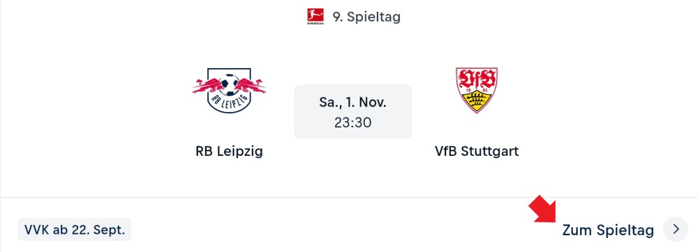 先々の試合のチケット発売日は「Fixture」から確認できます。(ドイツ語版では「SPIELPLAN」)