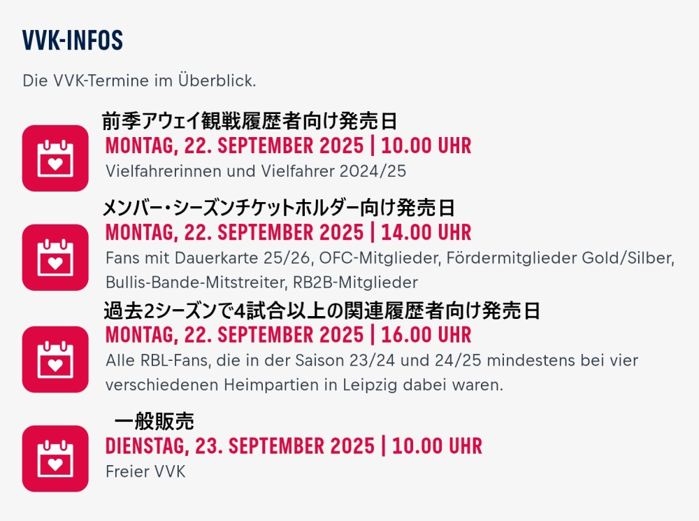最新のチケット発売日情報は「VORERKAUF-TERMÜBERSICHT(先行発売日情報) 」から確認できますが、直近の試合の発売状況しか表示されません。